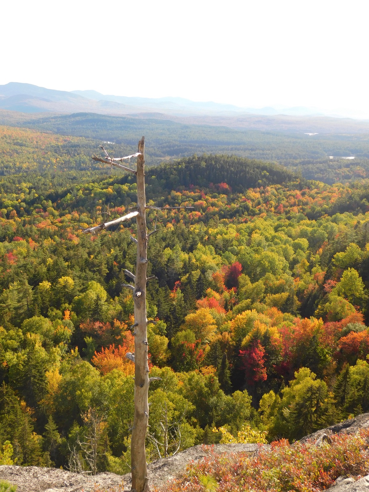 There was no trailhead sign for this popular local mountain, but the path was both easy to find and to follow. When we visited, we found the route marked with ribbon tags and blazes. Part of the trail swings through a delightfully cool and mossy forest. At 0.9 miles, the trail emerges onto a “false summit” — the actual wooded 2,113-foot summit is 0.4 miles farther on. But the summit has just a scratchy view through pines so you might want to conclude your hike at this peak. If you are good on your feet, I recommend making your way to an open ledge here (it takes a tiny bit of scrambling down and up rock) for expansive southerly vistas.